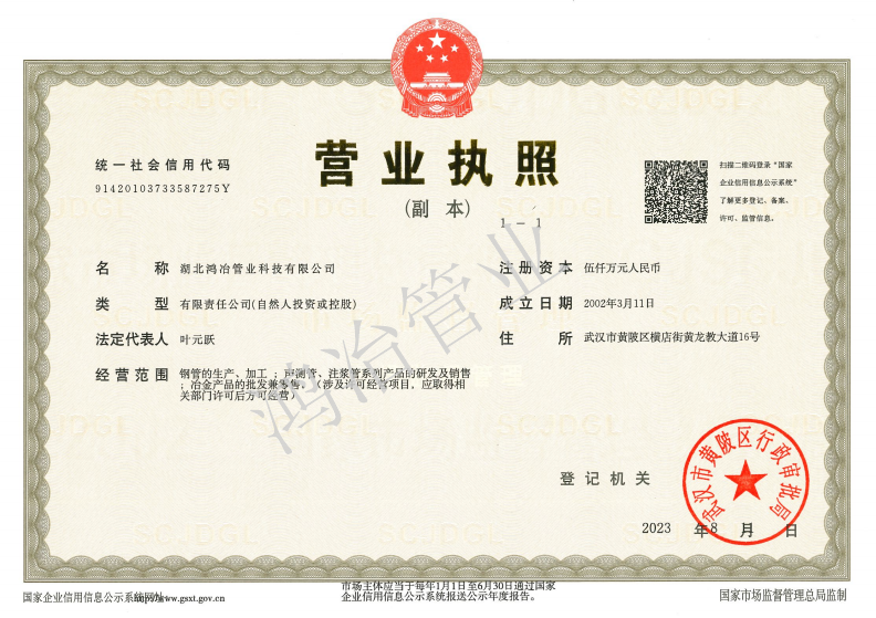 湖北省武漢市黃陂區(qū)橫店街道黃龍教大道16號鴻冶管業(yè)